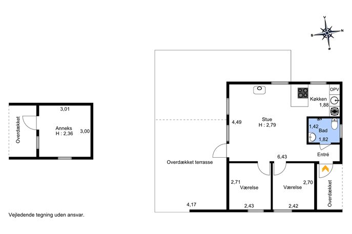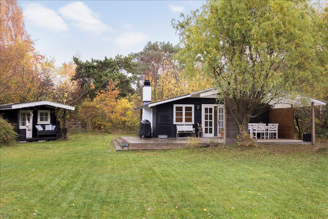 Ude er stemningen måske husets største aktiv. Grunden på 1.205 m² er grøn, ugeneret og let at holde, omkranset af træer og buske, der skaber læ og privatliv. Mod syd breder de store terrasser sig, så du kan følge solen fra den tidlige formiddag til de lange aftener; en del er overdækket, og netop her får du årets første frokoster i ly for en sommerbyge. I den fjernere del af haven ligger et hyggeligt anneks – et rart sted til gæster eller en rolig lur med døren åben og fuglesang som bagtæppe. Ved indkørslen er der carport med indbygget skur, perfekt til cykler, brænde, havemøbler og alt strandgrejet.
