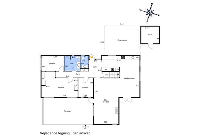 Indenfor mødes du af en indbydende og funktionel planløsning. Det store, lyse opholdsrum er boligens naturlige samlingspunkt, hvor stue og nyt køkken-alrum ligger i åben og harmonisk forbindelse. Her er god plads til både hverdag og gæster, og de store vinduespartier sørger for et smukt lysindfald dagen igennem. Fra både opholdsrum og køkken er der direkte udgang til terrassen, som gør udelivet til en integreret del af hverdagen i sommerhalvåret.
