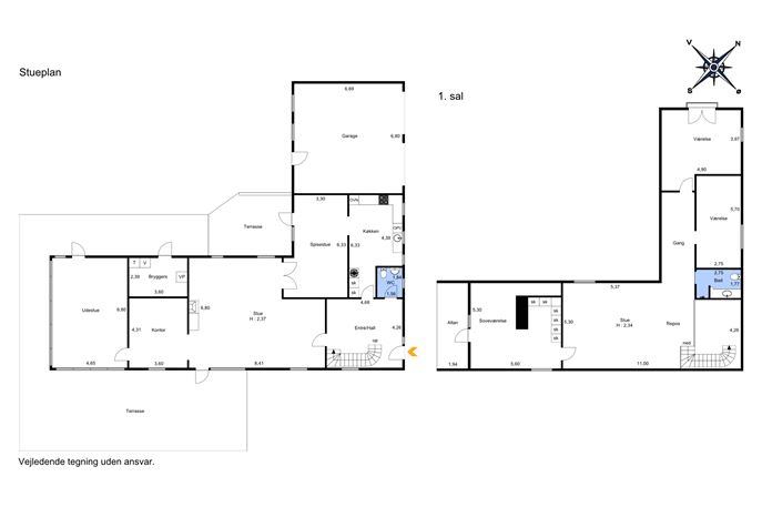 Indeholder smukkeste hall med flot svungen trappe til 1. sal, gæstetoilet, pænt køkken med spiseplads og adgang til spisestue. Stor opholdsstue med pejseindsats, kontor/stue med udgang til skønneste udestue hvorfra have og dyrelivet kan nydes. Teknik/vaskerum.