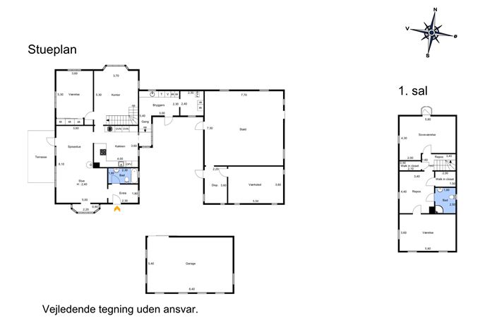 På første sal er der en hyggelig værelsesafdeling med to store, lyse værelser, begge med adgang til egne walk-in closets eller opbevaringsrum. Et møblerbart repos binder etagen sammen og kan bruges til eksempelvis hyggekrog, hjemmearbejdsplads eller legeområde. Et elegant badeværelse med italienske fliser og separat bruseniche fuldender etagen og tilfører et strejf af luksus.